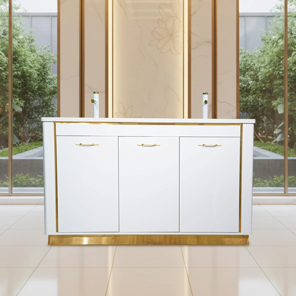 Introducing the Lux Sink WB-02—a masterpiece of modern elegance and refined functionality. With its pristine white high-gloss finish, accented by radiant gold trim and sleek hardware, this vanity sink unit redefines sophistication for upscale salons and luxury homes alike.